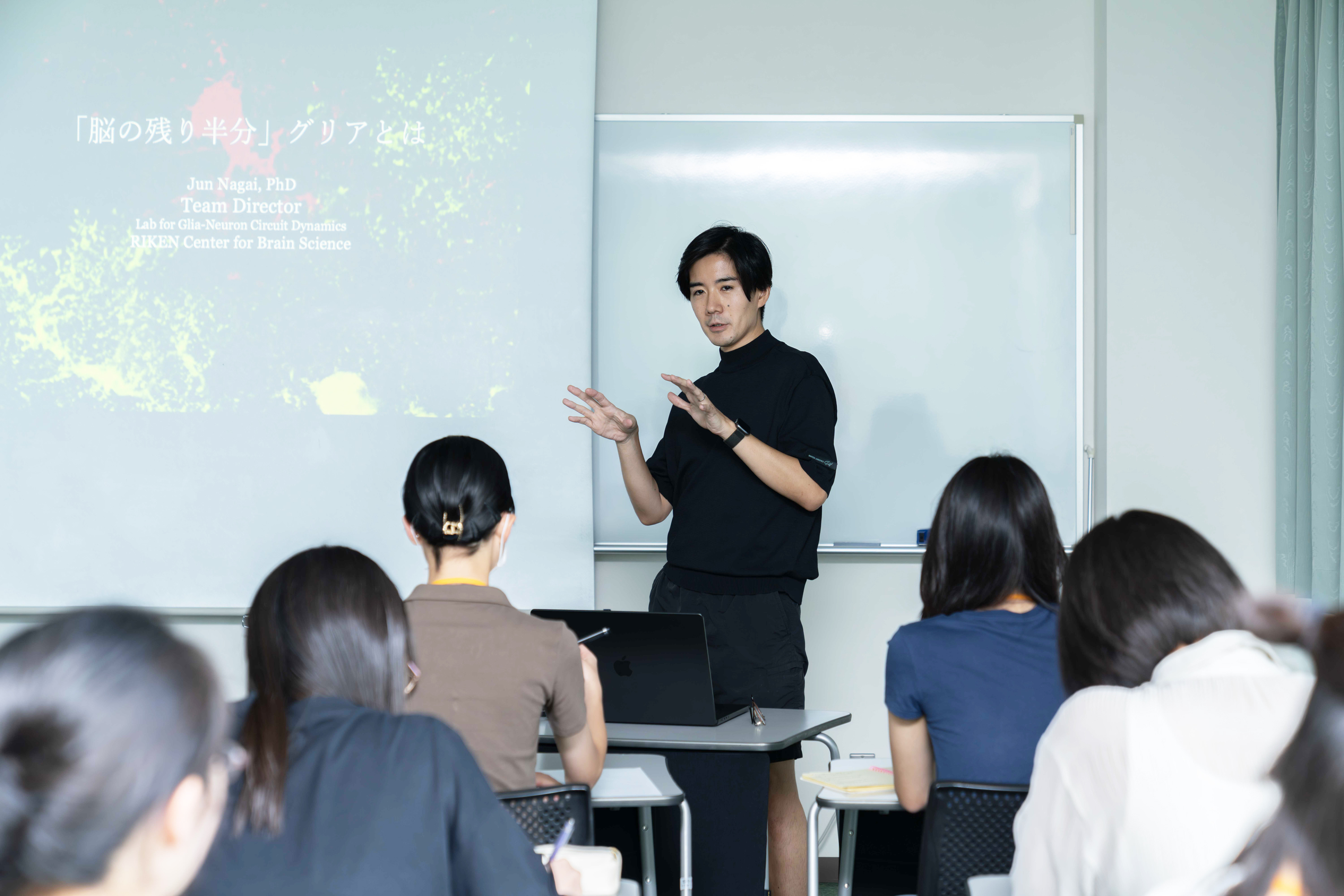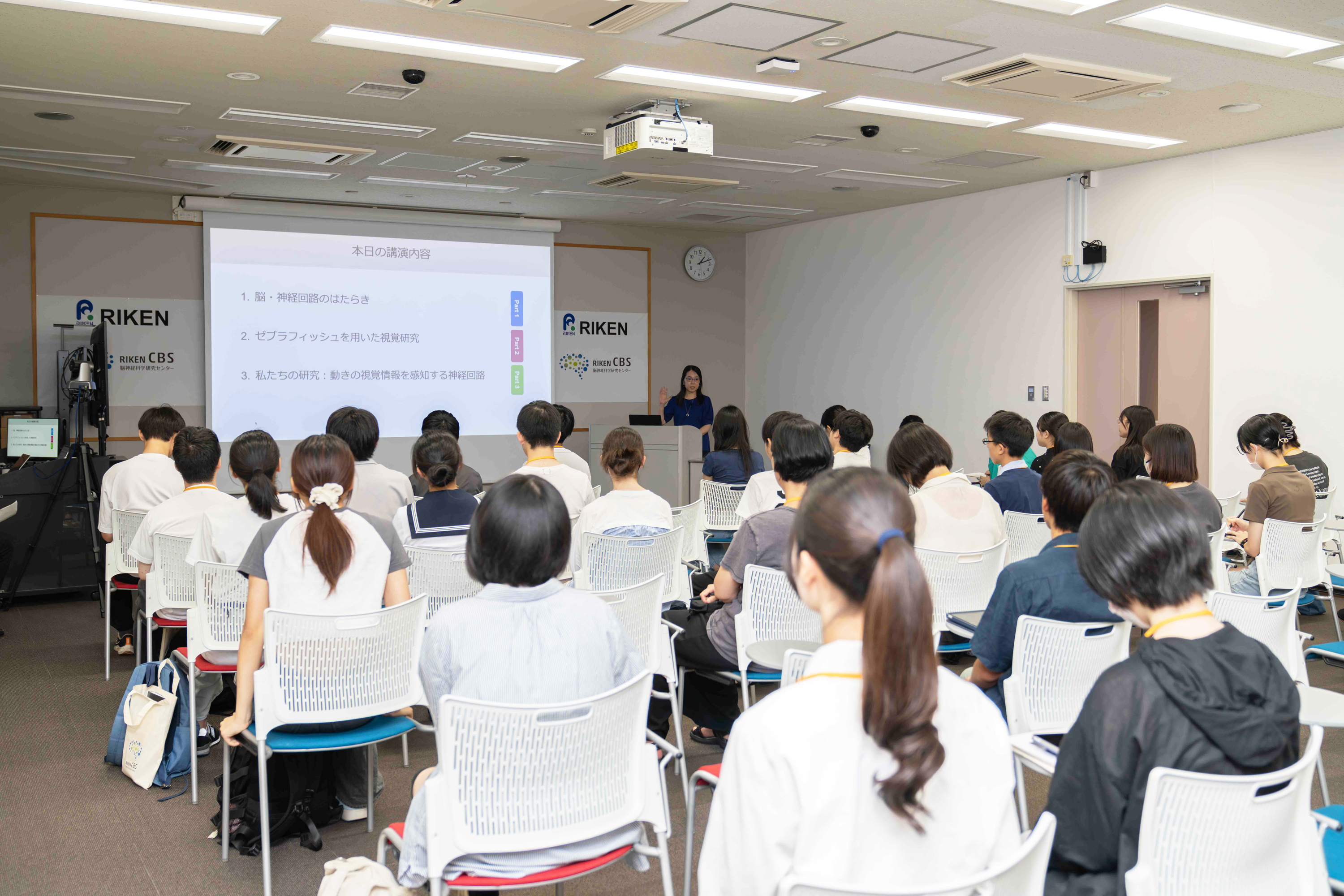 センター長による開会の挨拶の後、久保チームディレクターによる講義が続きました。脳が透明な魚類ゼブラフィッシュを使った、神経活動のイメージング実験やそこから分かってきた情報処理の仕組みについてのお話を、参加者は目を輝かせて聞いていました。その後グループに分かれ、ラボ見学では研究者へ活発に質問したり模擬実験を間近に見たり、リアルな研究現場を楽しんでいただけたのではないかと思います。