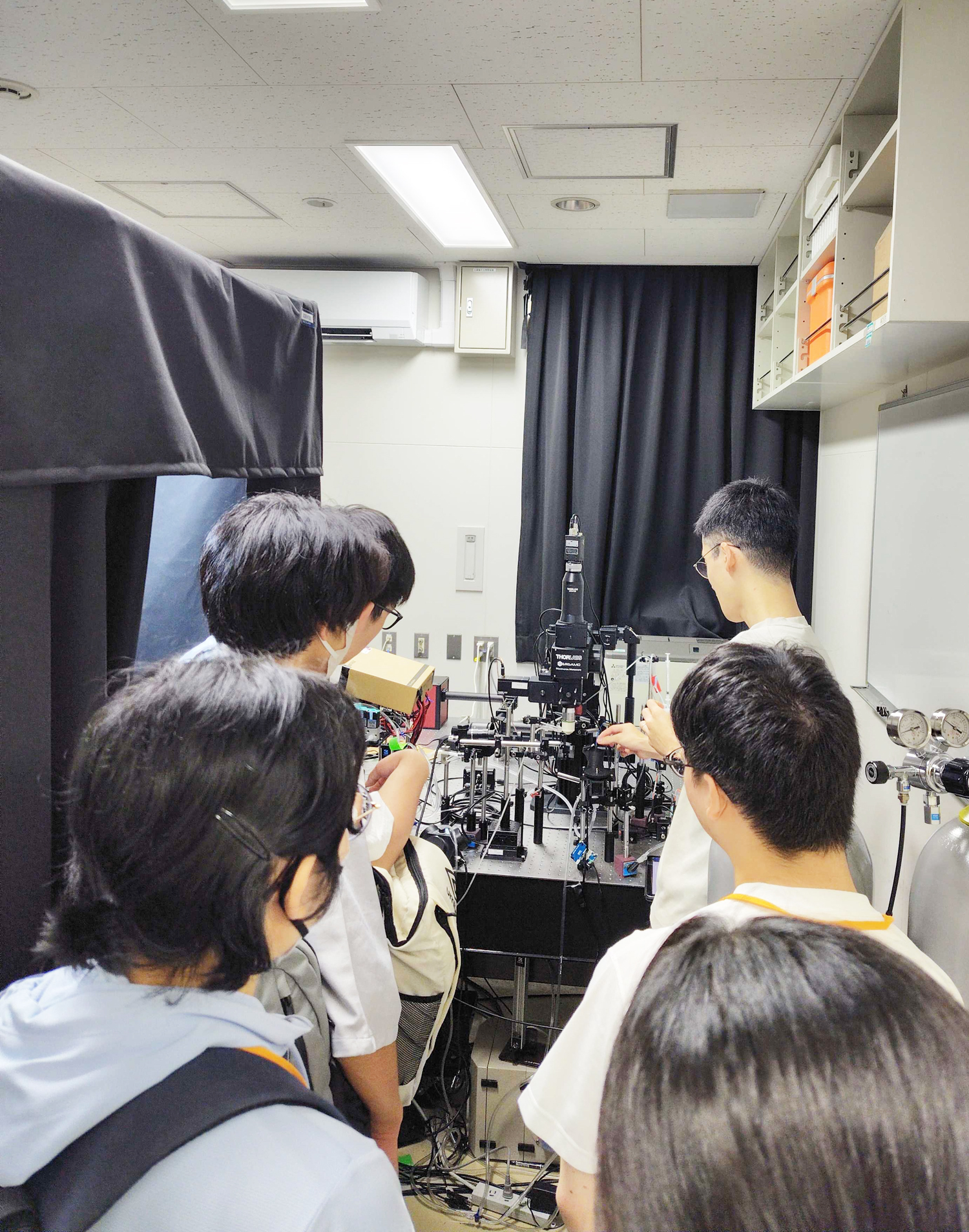 「脳の中を“見る”科学 〜ゼブラフィッシュが解き明かす感覚と行動のしくみ〜」と題した全体講演の後、少人数のグループに分かれて研究室見学を行い、見学後アンケート記入をし、展示施設Brain Boxの見学をした。
